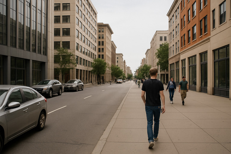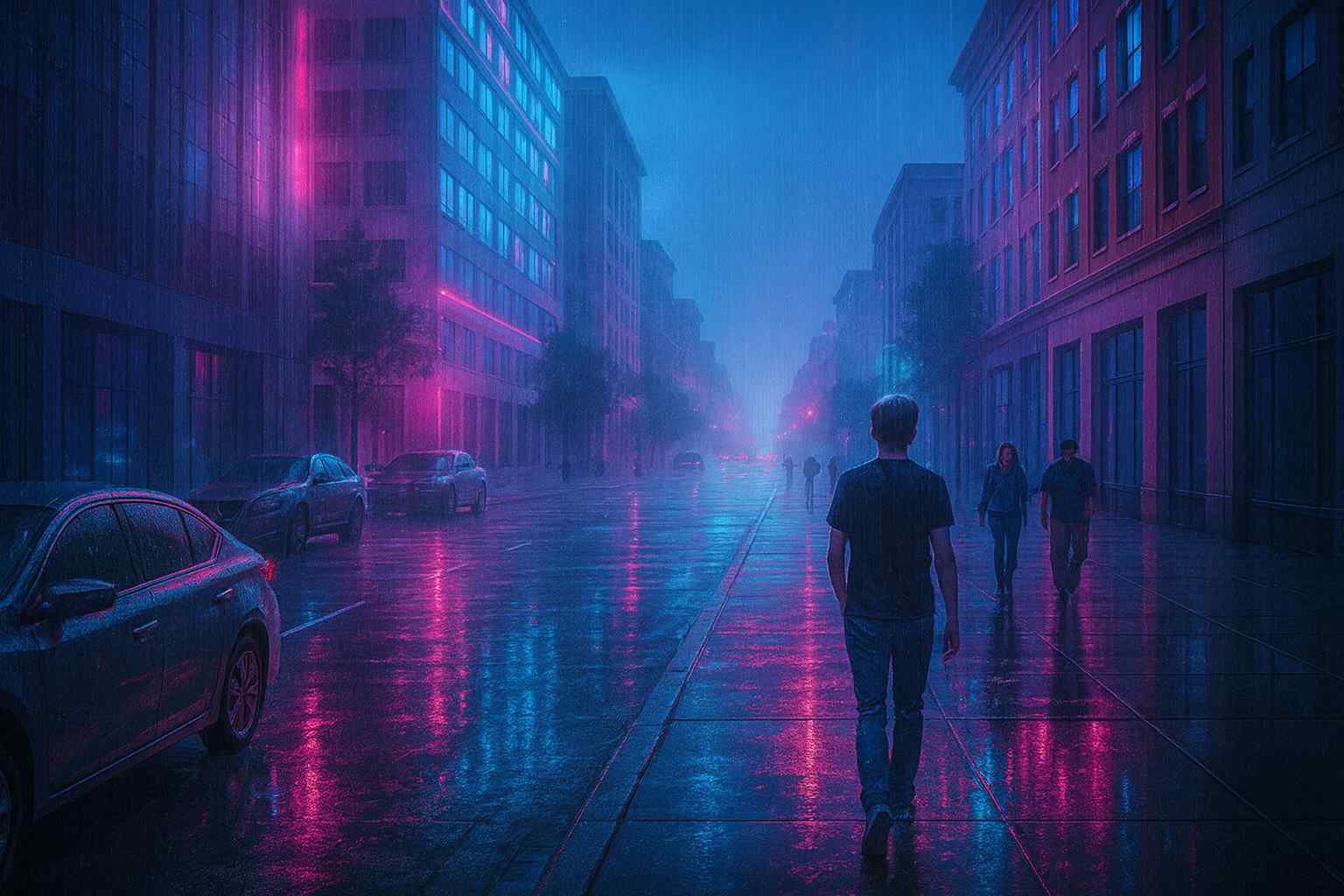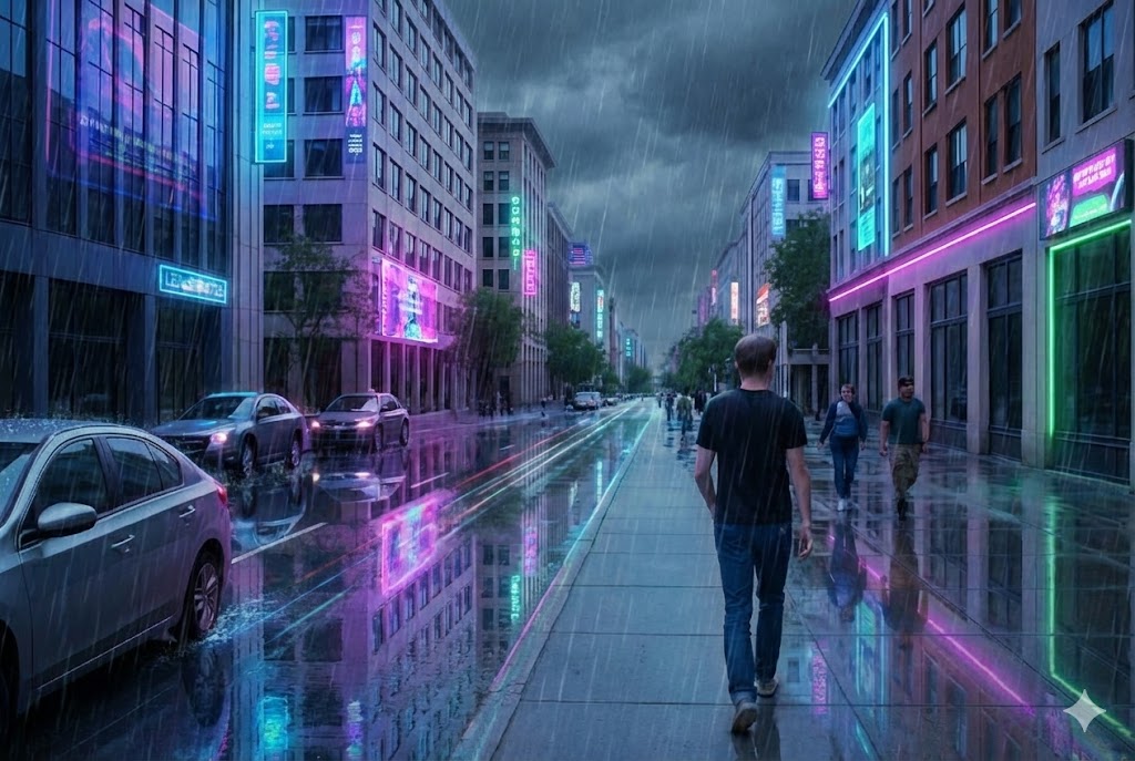 “Turn this street photo into a rainy cyberpunk version while keeping the same people and buildings exactly in place. Add neon reflections on the road"