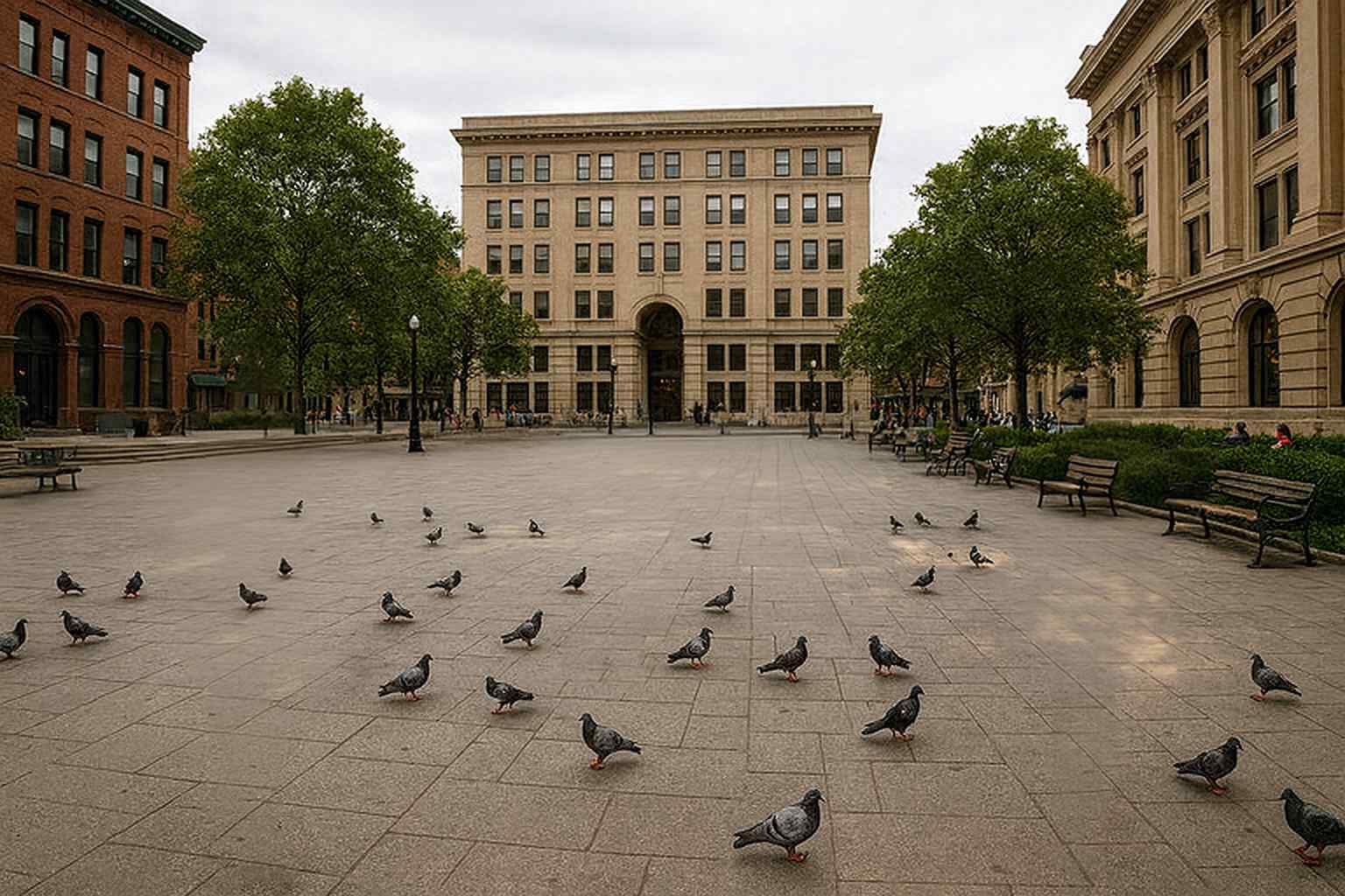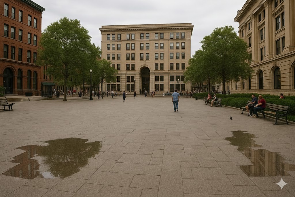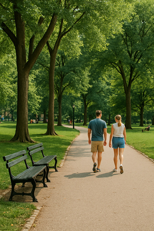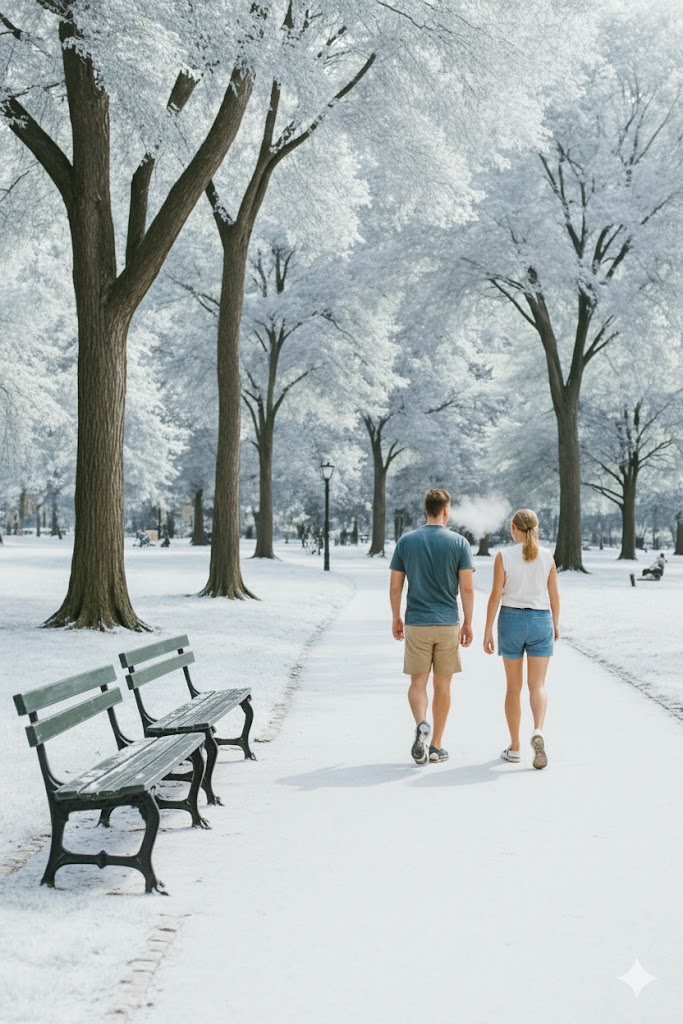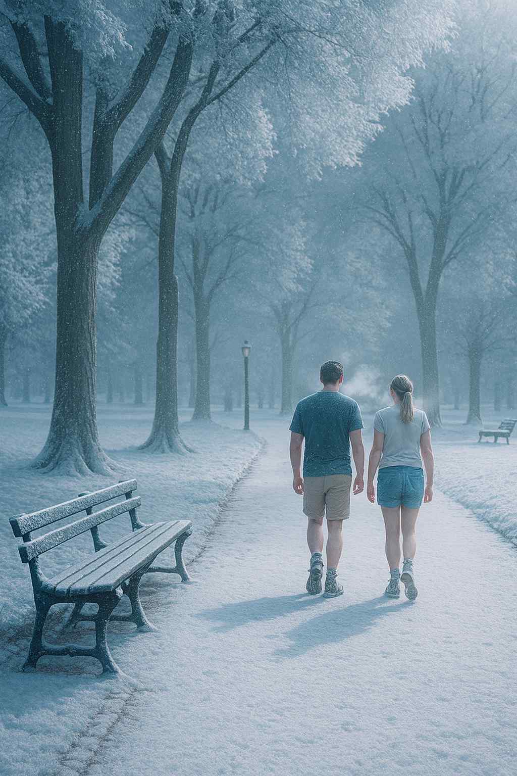 Prompt: “Create a winter version of this park scene: snow, foggy breath, cold lighting.”