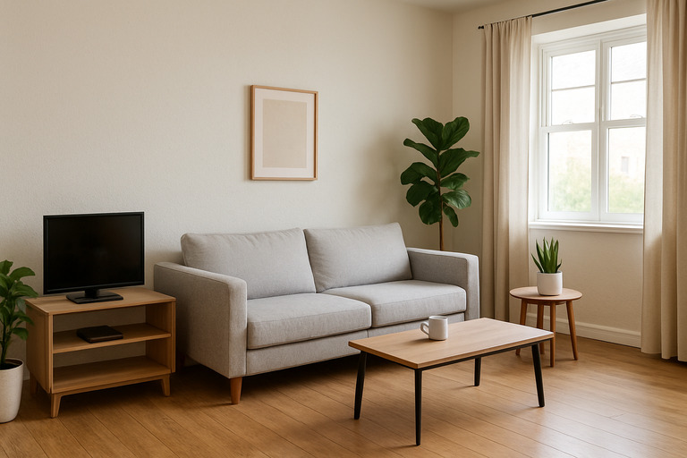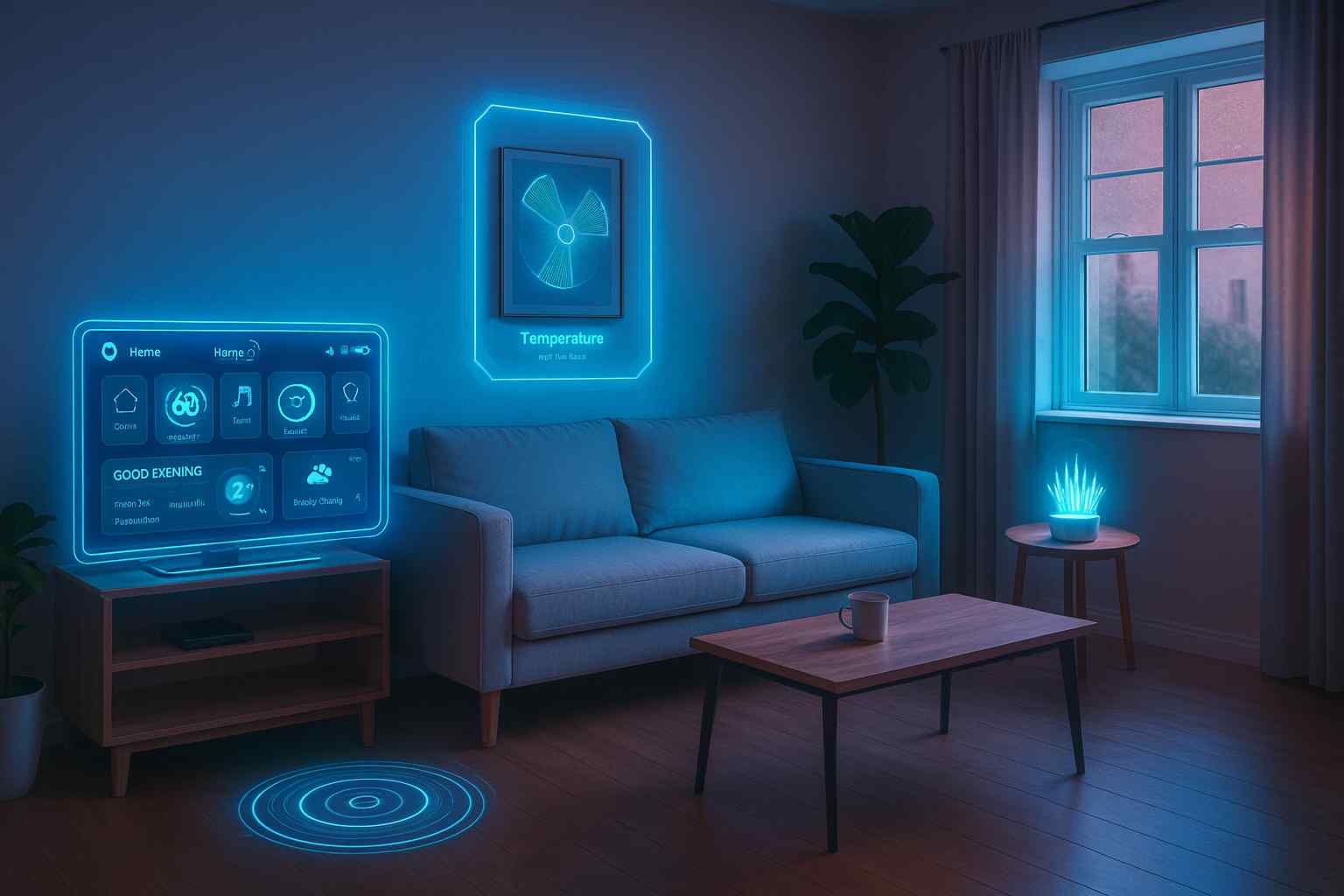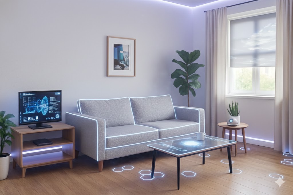 Prompt: “Transform this room into a futuristic smart home while keeping the furniture layout.”