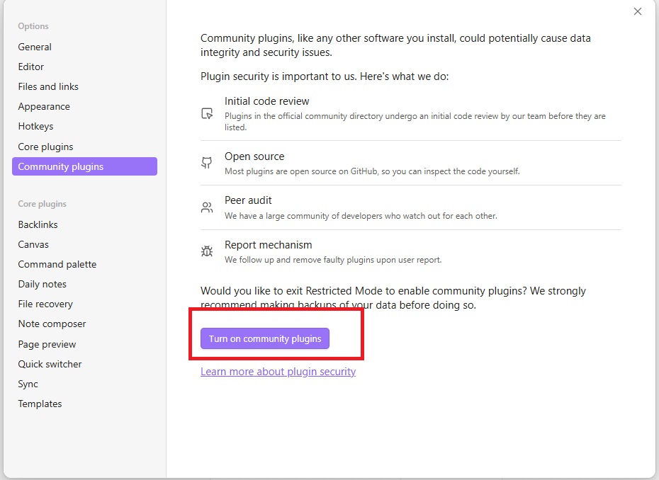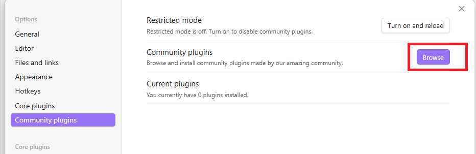 2. Go to Community Plugins → Turn on community plugins → Browse