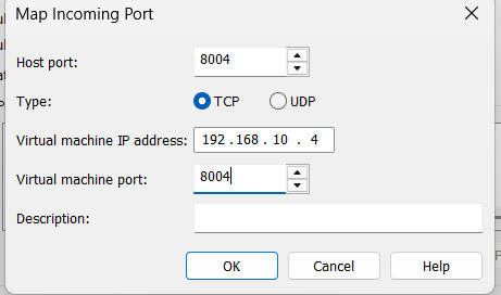 | Service | Host Port | VM IP | VM Port | Description |