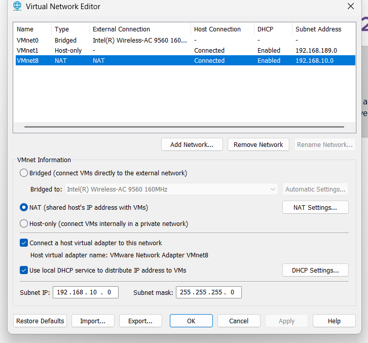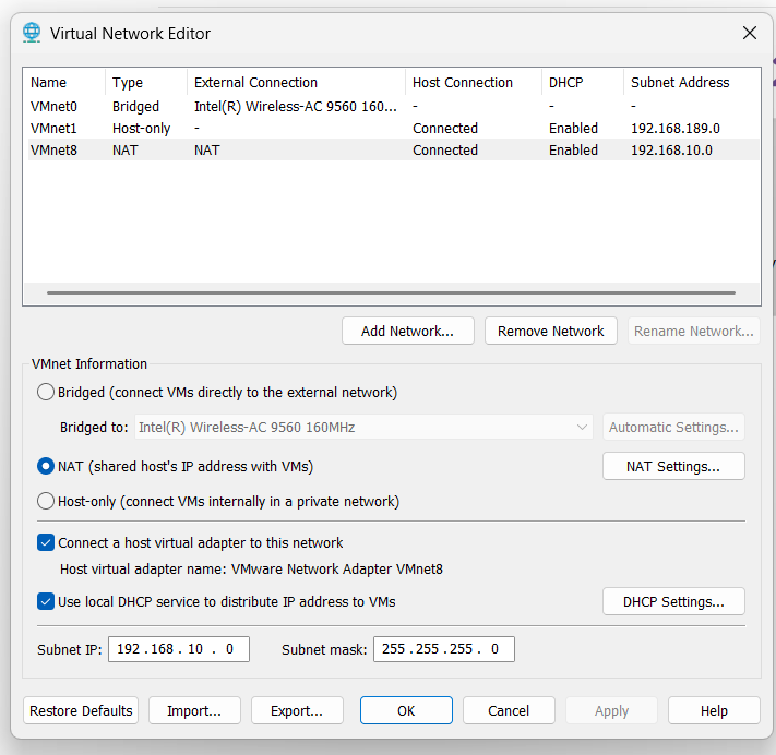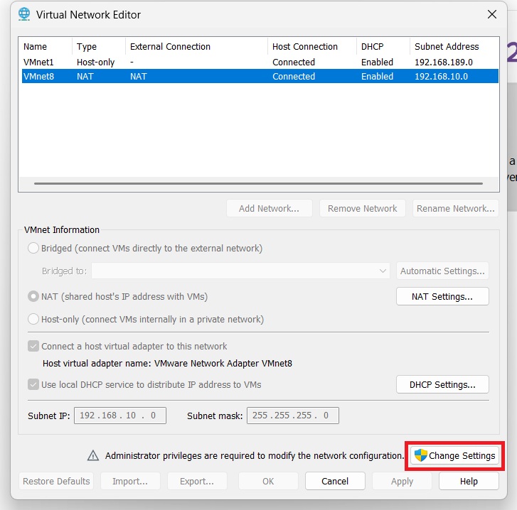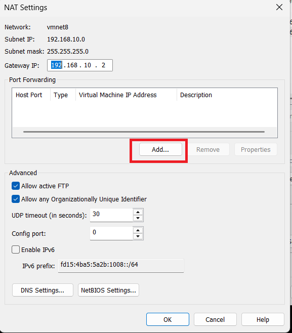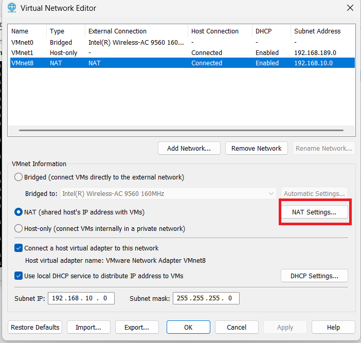 - Open Virtual Network Editor → NAT Settings